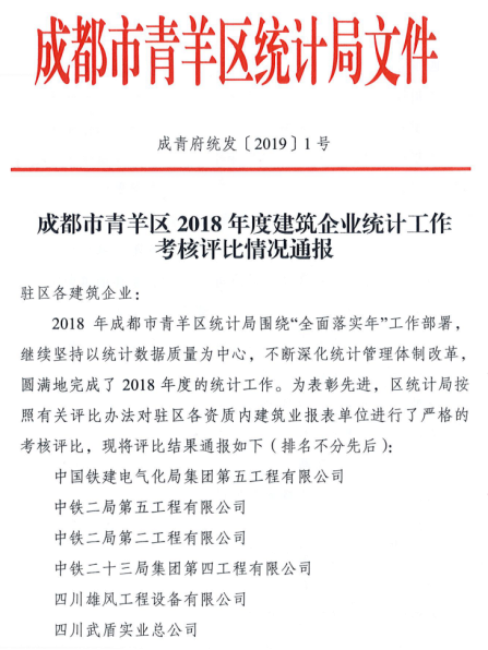 由于上報時間及時、數(shù)據(jù)準確、流程規(guī)范,集團公司、華途公司、華霆公司在青羊區(qū)200余家建筑企業(yè)統(tǒng)計工作考核評比工作中脫穎而出,體現(xiàn)了集團公司及子公司已規(guī)范按照國家大數(shù)據(jù)統(tǒng)計工作要求開展、落實工作,具有先進性及代表性。