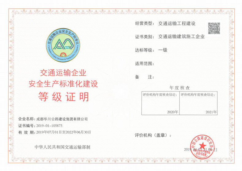 按照集團公司統(tǒng)一部署,于2018年10月啟動達標(biāo)創(chuàng)建工作。通過公司自查、備考、評價、驗收階段,穩(wěn)步推進標(biāo)準(zhǔn)化達標(biāo)的各項工作開展。2019年4月9日-11日,交通運輸部達標(biāo)評審專家組對集團公司進行一級達標(biāo)驗收,對集團安全生產(chǎn)標(biāo)準(zhǔn)化工作給予充分肯定。最終,集團公司順利通過交通運輸建筑施工企業(yè)安全生產(chǎn)標(biāo)準(zhǔn)化達標(biāo)認證考核。