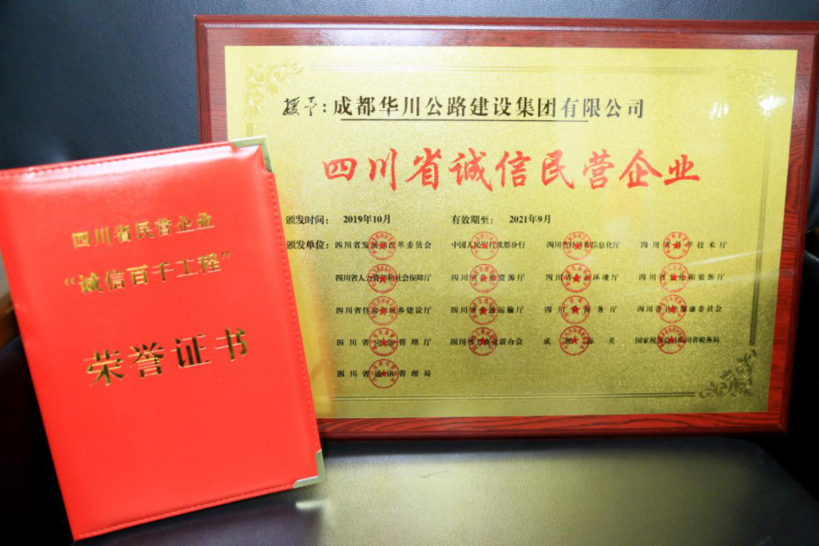 另訊,集團(tuán)下屬成都華鼎市政工程有限公司也通過自主申報(bào)評選,成功獲評“四川省誠信民營企業(yè)”榮譽(yù)稱號。