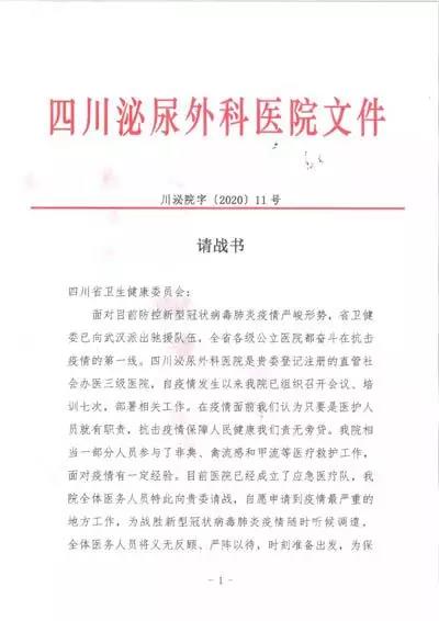 1月28日集團旗下四川省泌尿外科醫(yī)院黨政工群各級領導干部、防控應急醫(yī)療隊和醫(yī)院技術(shù)骨干100余人召開請戰(zhàn)大會,主動向省衛(wèi)健委請戰(zhàn)馳援武漢,請戰(zhàn)書已于當日送達,省衛(wèi)健委對醫(yī)護人員積極抗擊疫情給予肯定贊揚,并指示爭取第三批次派遣醫(yī)護人員前往疫區(qū)第一線。1月31日起,該院根據(jù)省中醫(yī)管理局公布的冬春季呼吸道傳染病預防建議處方,緊急熬制中藥湯劑,免費向市民發(fā)放,每天限量供應1000人份(6000袋)。